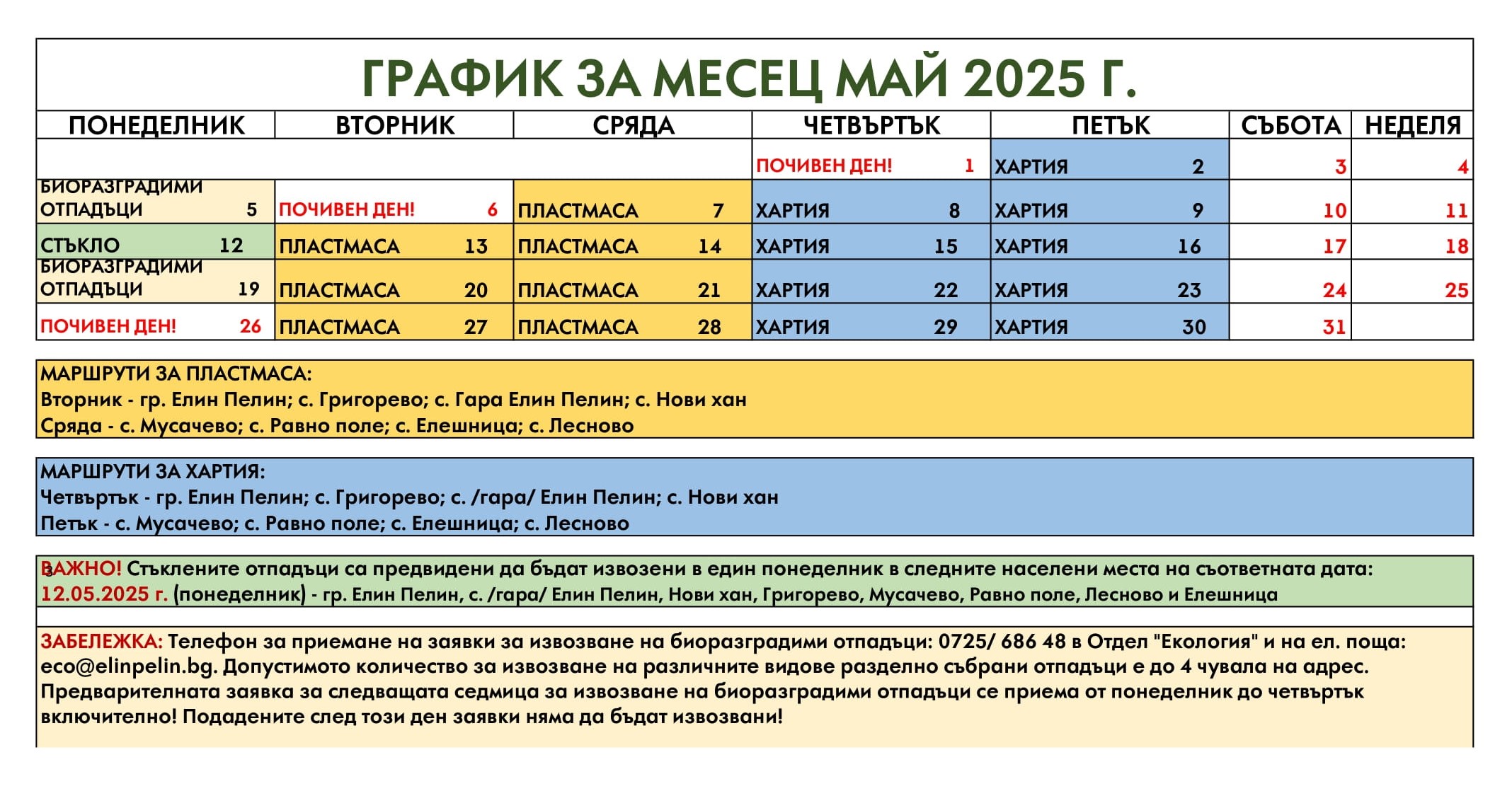 Графикът за извозване на рециклируеми отпадъци от населените места в община Елин Пелин през месец май 2025 г. се изпълнява на седмична база от общинското предприятие "БКД - Елин Пелин".