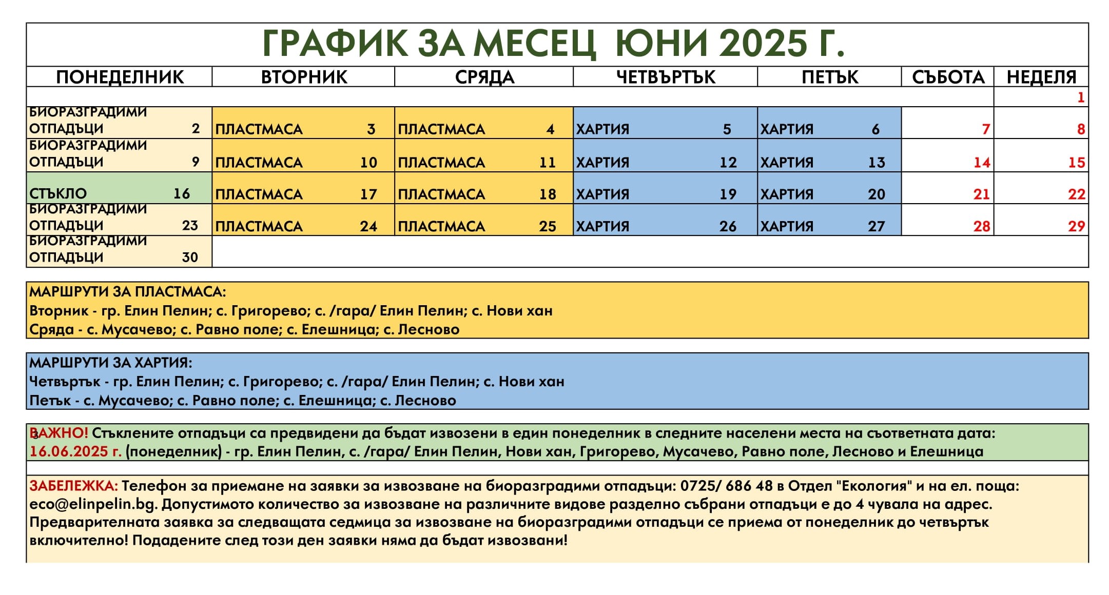 Графикът за извозване на рециклируеми отпадъци от населените места в община Елин Пелин през месец юни 2025 г. се изпълнява на седмична база от общинското предприятие "БКД - Елин Пелин".