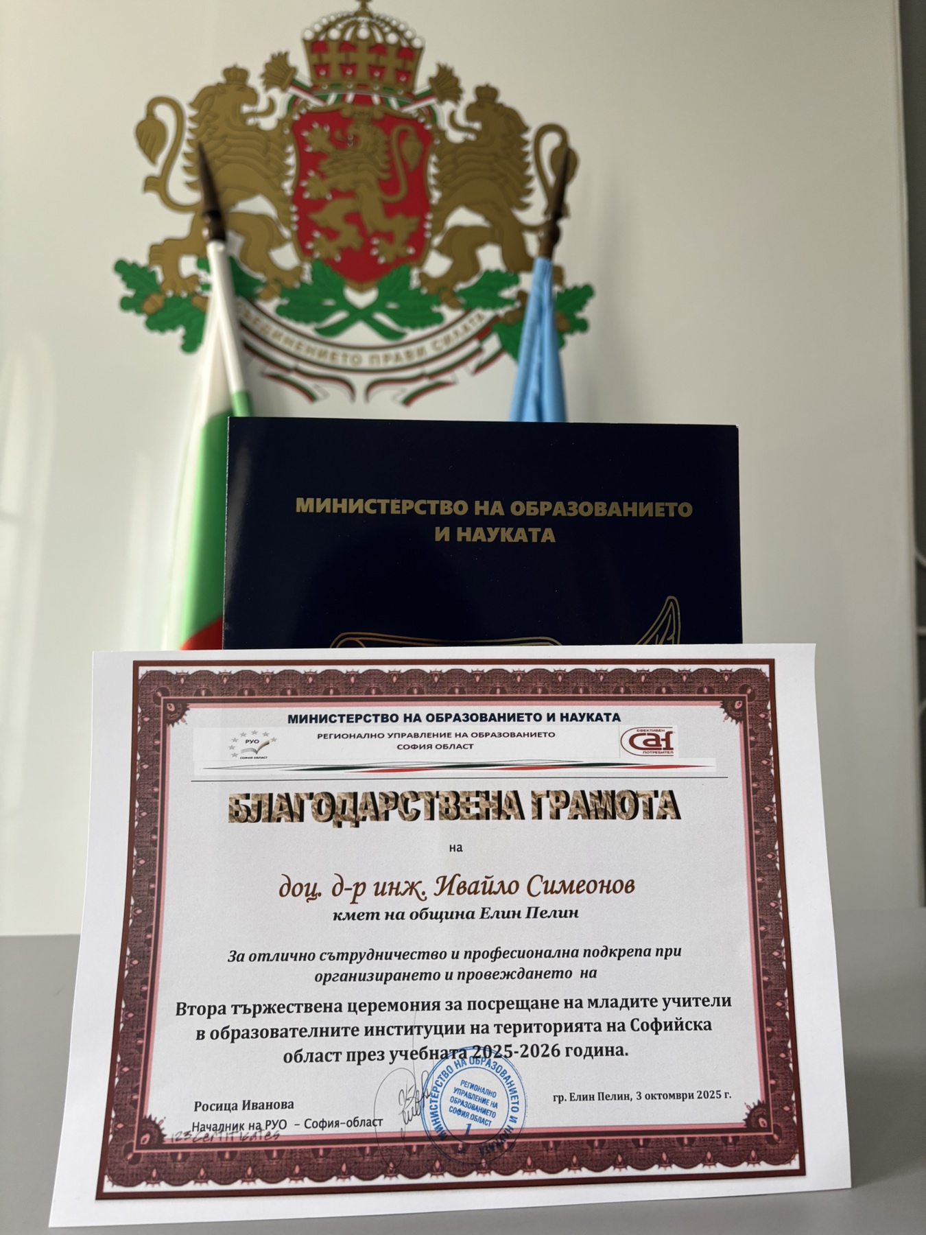 Кметът на Община Елин Пелин, г-н Ивайло Симеонов получи благодарствена грамота от г-жа Росица Иванова, в знак на признателност за отличното сътрудничество и професионалната подкрепа при организирането на втората тържествена церемония по посрещане на младите учители в образователните институции на територията на Софийска област през учебната 2025/2026 година.