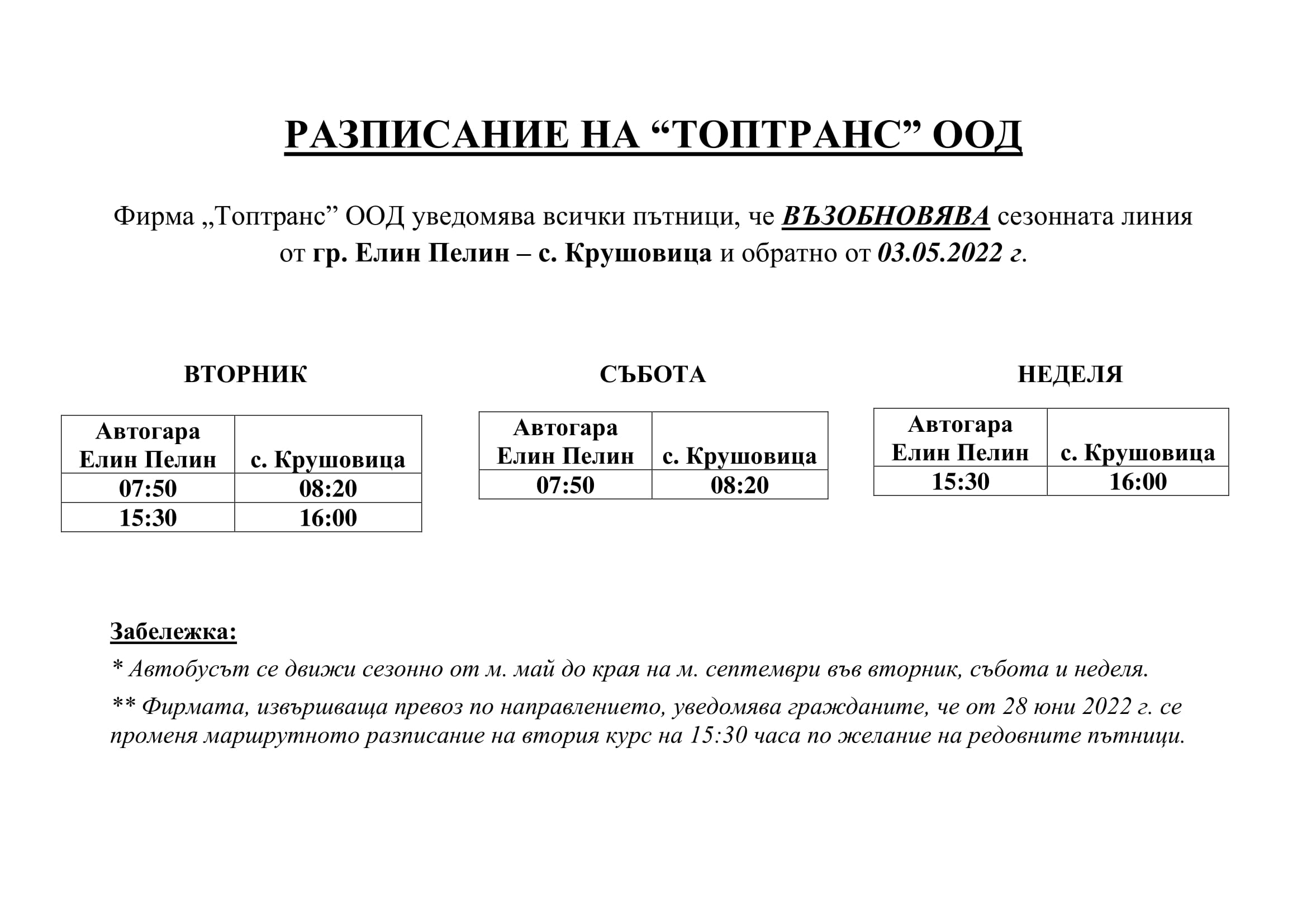 Фирма „Топтранс” ООД уведомява всички пътници, че ВЪЗОБНОВЯВА сезонната линия от гр. Елин Пелин – с. Крушовица и обратно от 03.05.2022 г.