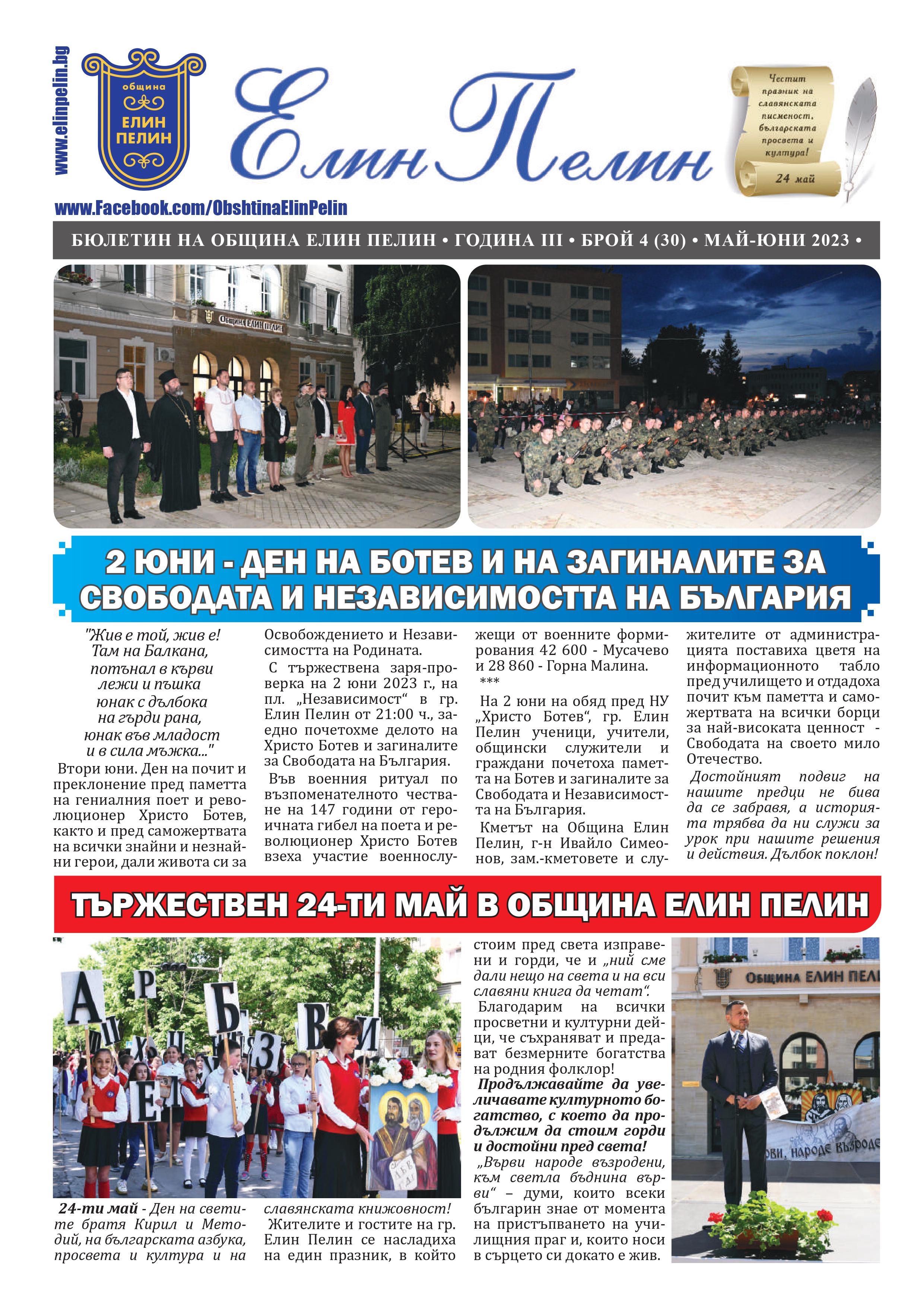 Брой 04/2023 г. на новия информационен бюлетин с избрани новини и събития от Община Елин Пелин, който се издава на месечна база.