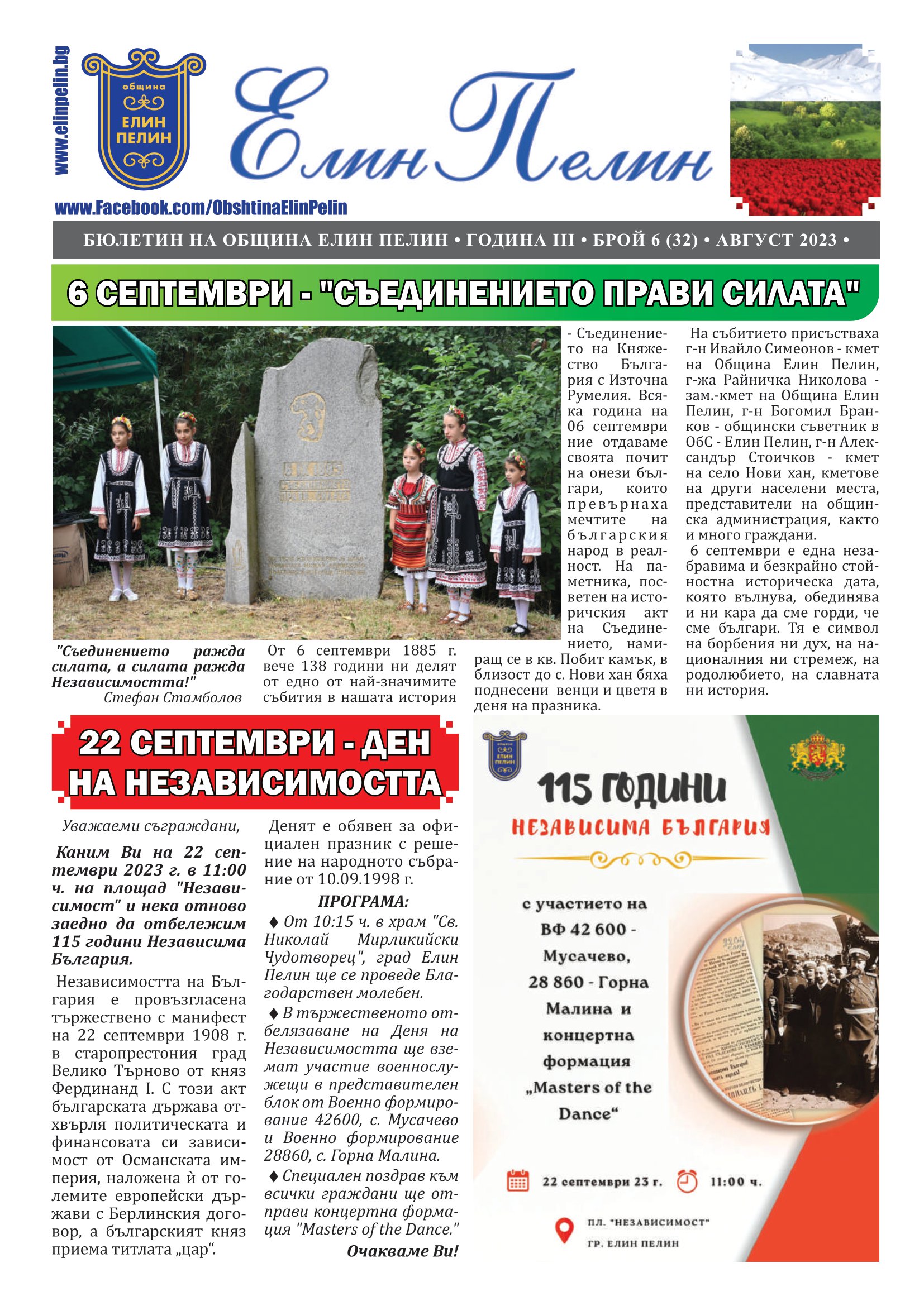 Брой 06/2023 г. на новия информационен бюлетин с избрани новини и събития от Община Елин Пелин, който се издава на месечна база.