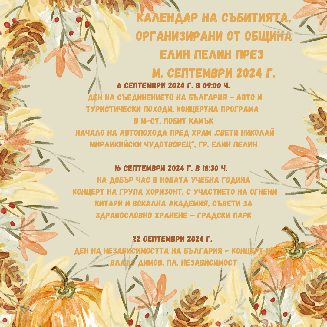 Уважаеми граждани, представяме на Вашето внимание календар с информация относно събитията в сферата на културата, празничните чествания и фестивали, които предстоят през месец ФЕВРУАРИ 2024 г. в община Елин Пелин.