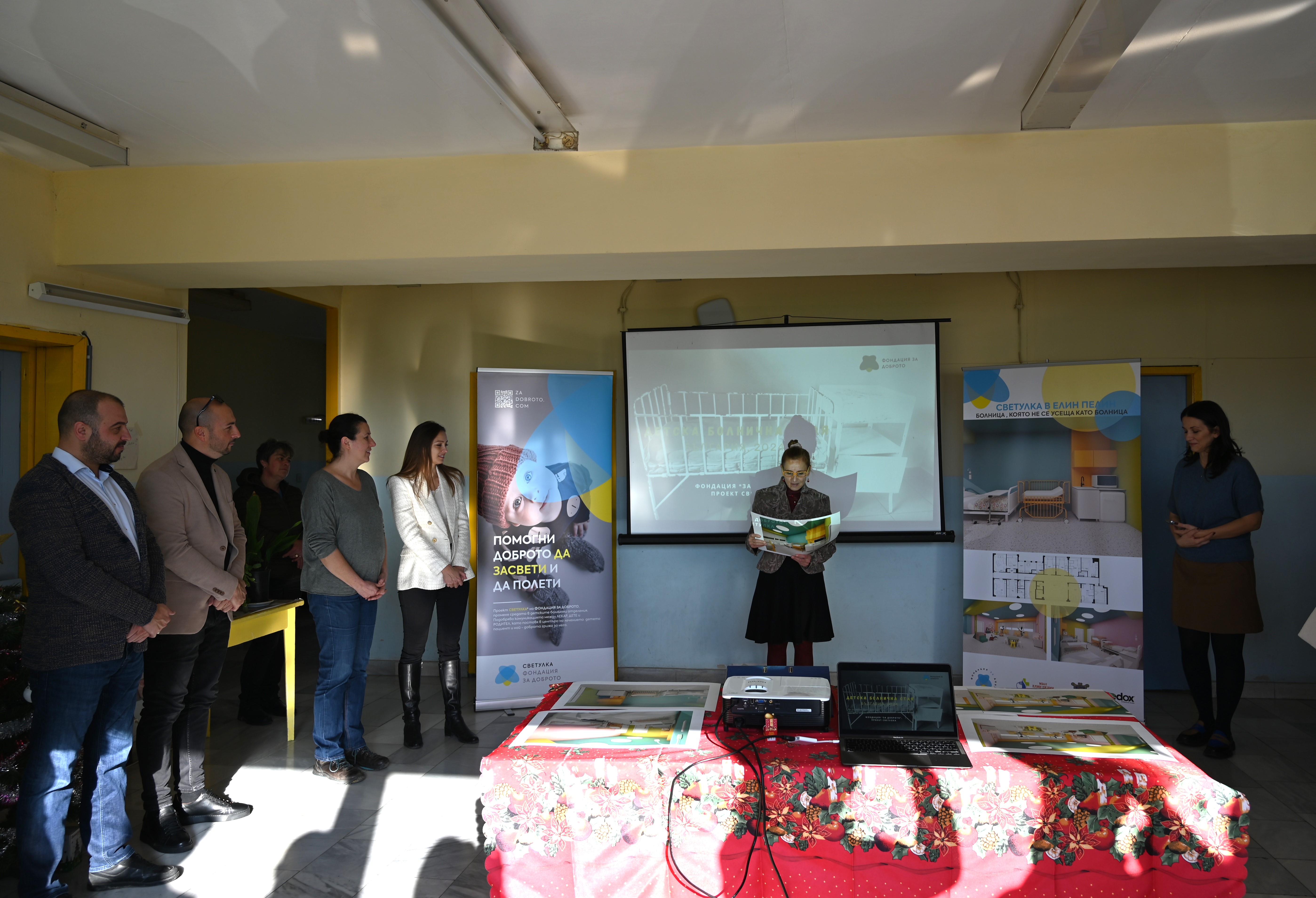 Фондация „За Доброто“, с експертната подкрепа на арх. Магдалена Славова, изготви цялостен архитектурен проект, с който ще преобрази педиатричното отделение. С проекта ще бъдат обновени и обзаведени всички пациентски стаи, приемния кабинет, манипулационната с интензивен сектор, както и служебните помещения. Ще бъде създадена удобна чакалня, а в сърцето на отделението ще се изгради кът за игра – най-голямата радост за най-малките пациенти. Освен това ще бъдат оборудвани няколко кухненски бокса, с хладилник, микровълнова фурна и кана за топла вода за максимален комфорт на пациентите и техните придружители. За удобството на придружителите ще бъдат осигурени и легла. Проектът предвижда закупуване на нови завивки, възглавници, спално бельо, както и поставяне на щори на прозорците и нощни лампи. Стените ще бъдат украсени с весели и ярки изображения, а пространствата ще се оживят със забавни играчки, създавайки топла и приятна атмосфера за децата. В изпълнението на проекта ще се включат както настоящи, така и нови дългосрочни партньори на Фондация „За Доброто“.