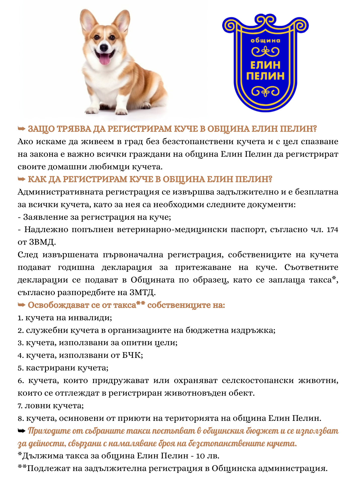 ВНИМАНИЕ! Община Елин Пелин предлага вариант за електронно подаване на документи за регистрация на куче - домашен любимец. Ако Вашето куче не е регистрирано, може да ни изпратете email с попълнените документи на адрес: eco@elinpelin.bg, /заявление, копие от паспорт на кучето/ и телефон за обратна връзка.