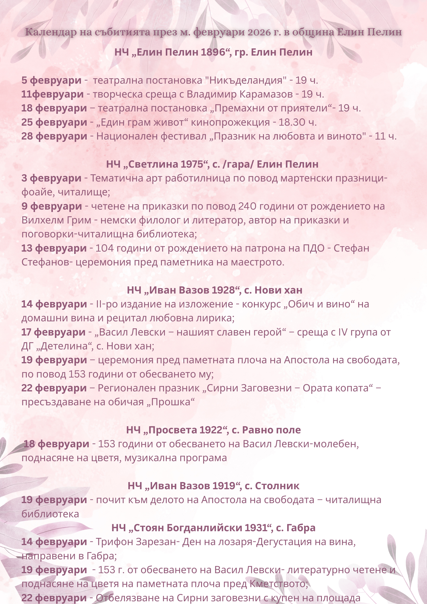 Представяме на Вашето внимание календар с информация относно събитията в сферата на културата, празничните чествания и фестивали, които предстоят през месец ФЕВРУАРИ 2026 г. на територията на община Елин Пелин.