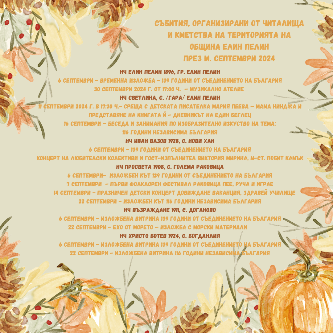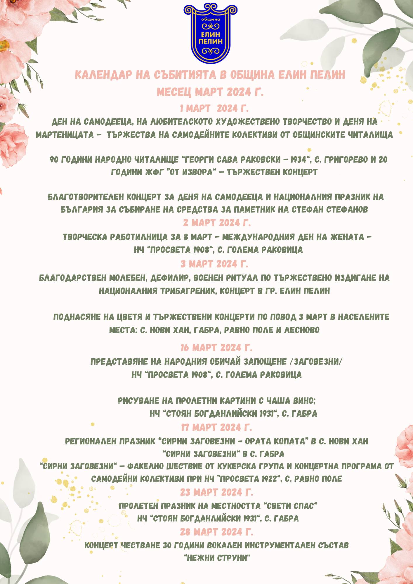 Уважаеми граждани, представяме на Вашето внимание календар с информация относно събитията в сферата на културата, празничните чествания и фестивали, които предстоят през месец МАРТ 2024 г. в община Елин Пелин.